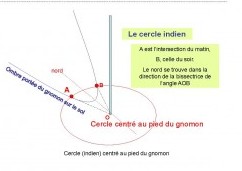 Pour déterminer le méridien passant le pied O du gnomon, on trace un cercle de centre O . On met en évidence les points A et B où l’ombre du haut du gnomon coupe ce cercle. Le méridien c’est la droite qui joint O au milieu de [AB].